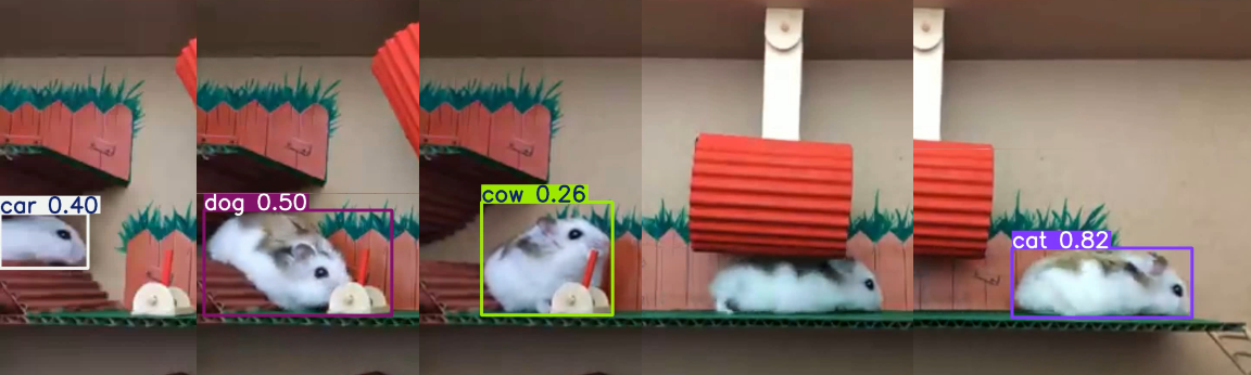 As can be seen in the frames shown above, the model is not able to correctly identify that the object it is detecting is a hamster. Also, as can be seen in the second frame from the right, there are moments when, as the hamster moves through small gaps, the model does not recognise it at all. Correctly identifying the hamster is something that can be addressed by training the model with a given data set, and this may also in turn allow it to detect the hamster in a wider range of environments and states such as squeezing through small gaps. | |||